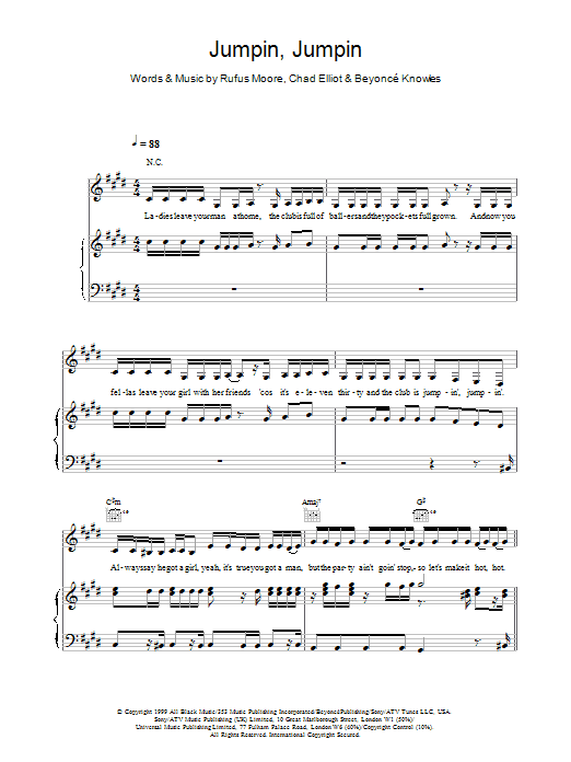 Download or print Destiny's Child Jumpin, Jumpin sheet music, chords and digital score arranged for Piano, Vocal & Guitar Chords (Right-Hand Melody). This Pop score includes 11 page(s).