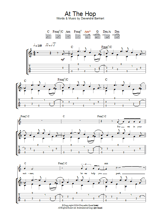 Download or print Devendra Banhart At The Hop sheet music, chords and digital score arranged for Guitar Tab. This Rock score includes 6 page(s).