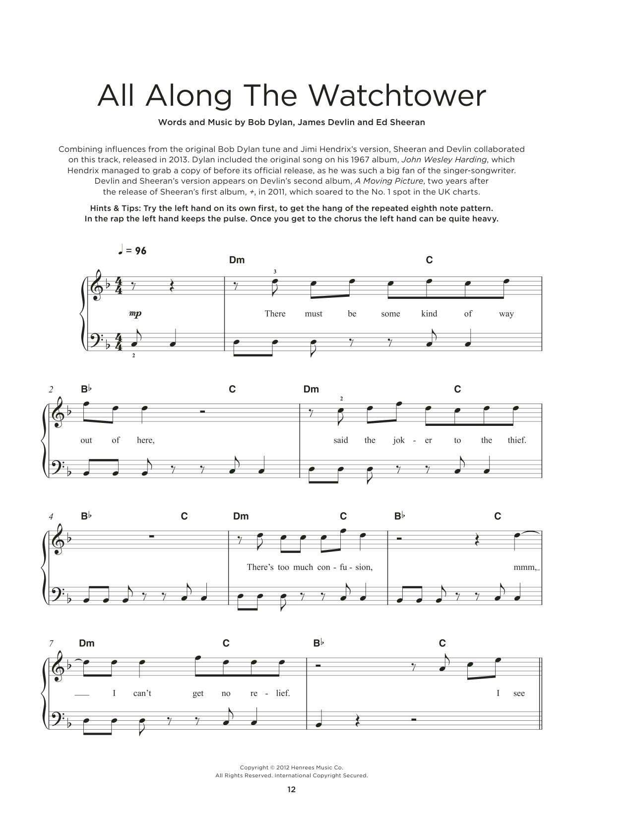 Download or print Devlin and Ed Sheeran All Along The Watchtower sheet music, chords and digital score arranged for Really Easy Piano. This Rock score includes 4 page(s).