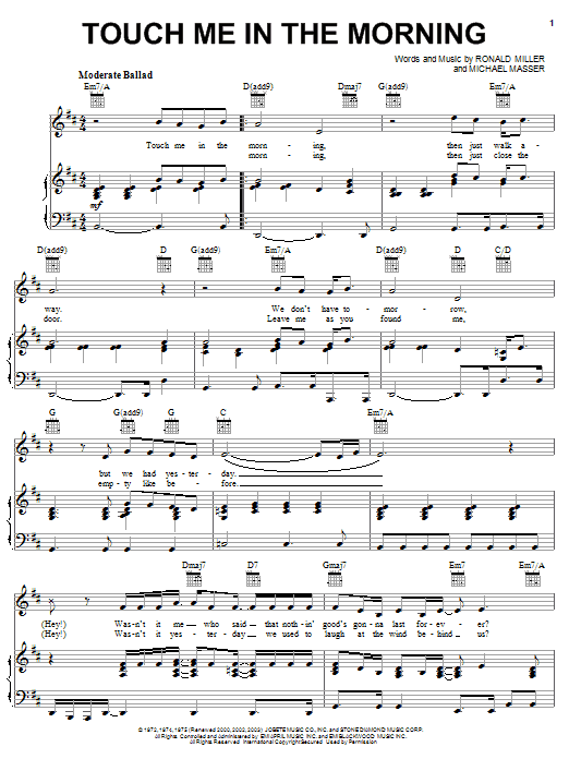 Download or print Diana Ross Touch Me In The Morning sheet music, chords and digital score arranged for Piano, Vocal & Guitar Chords (Right-Hand Melody). This Love score includes 4 page(s).