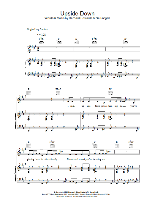 Download or print Diana Ross Upside Down sheet music, chords and digital score arranged for Guitar Chords/Lyrics. This Disco score includes 3 page(s).