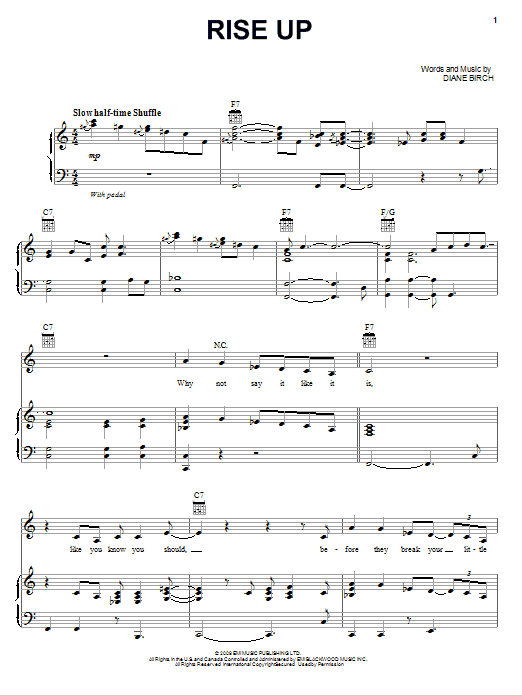 Download or print Diane Birch Rise Up sheet music, chords and digital score arranged for Piano, Vocal & Guitar Chords (Right-Hand Melody). This Blues score includes 9 page(s).