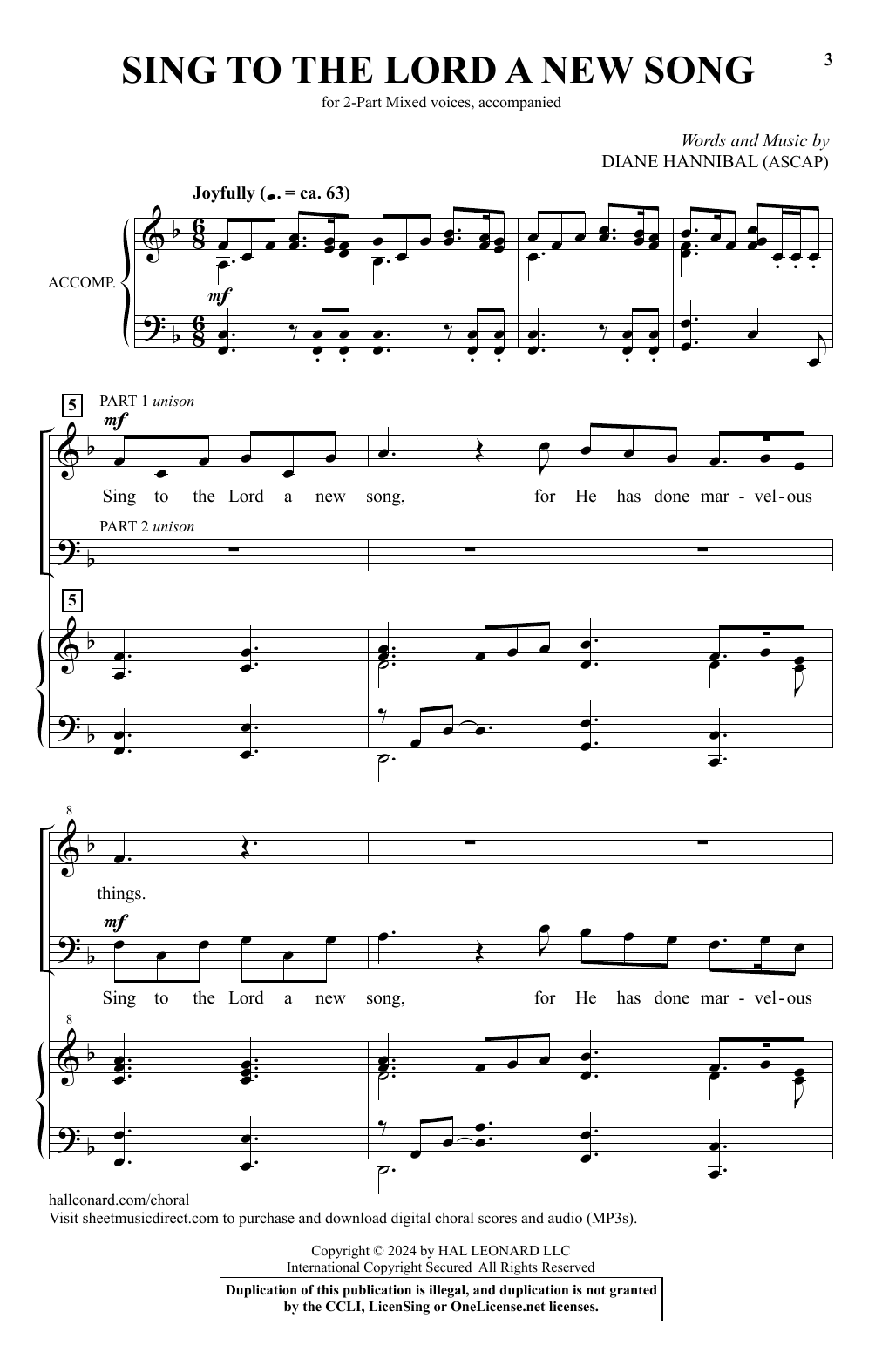 Download or print Diane Hannibal Sing To The Lord A New Song sheet music, chords and digital score arranged for 2-Part Choir. This Sacred score includes 8 page(s).