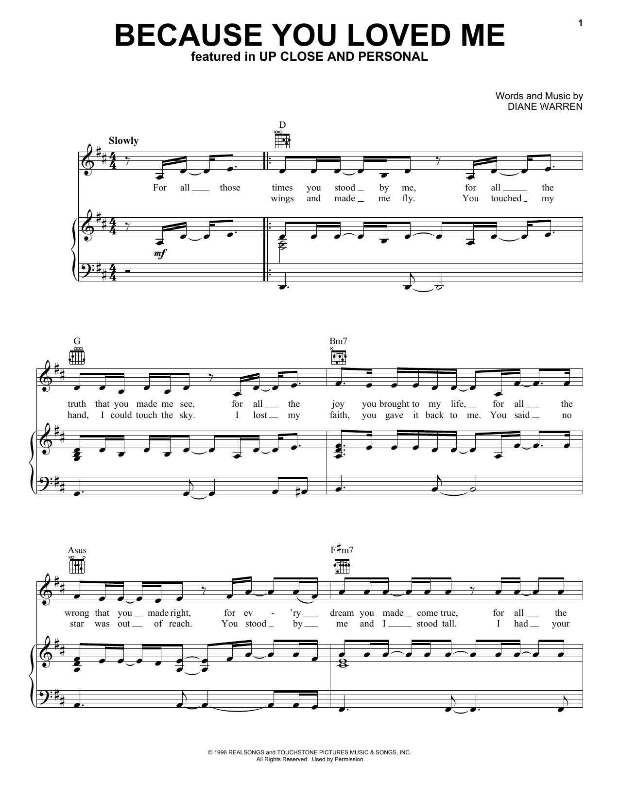 Download or print Diane Warren Because You Loved Me sheet music, chords and digital score arranged for Very Easy Piano. This Love score includes 5 page(s).
