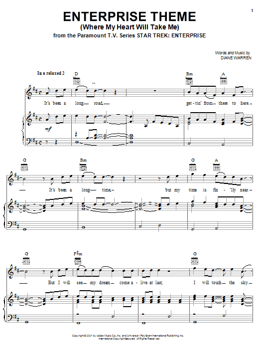 Download or print Diane Warren Enterprise Theme (Where My Heart Will Take Me) sheet music, chords and digital score arranged for Piano, Vocal & Guitar Chords (Right-Hand Melody). This Film/TV score includes 3 page(s).