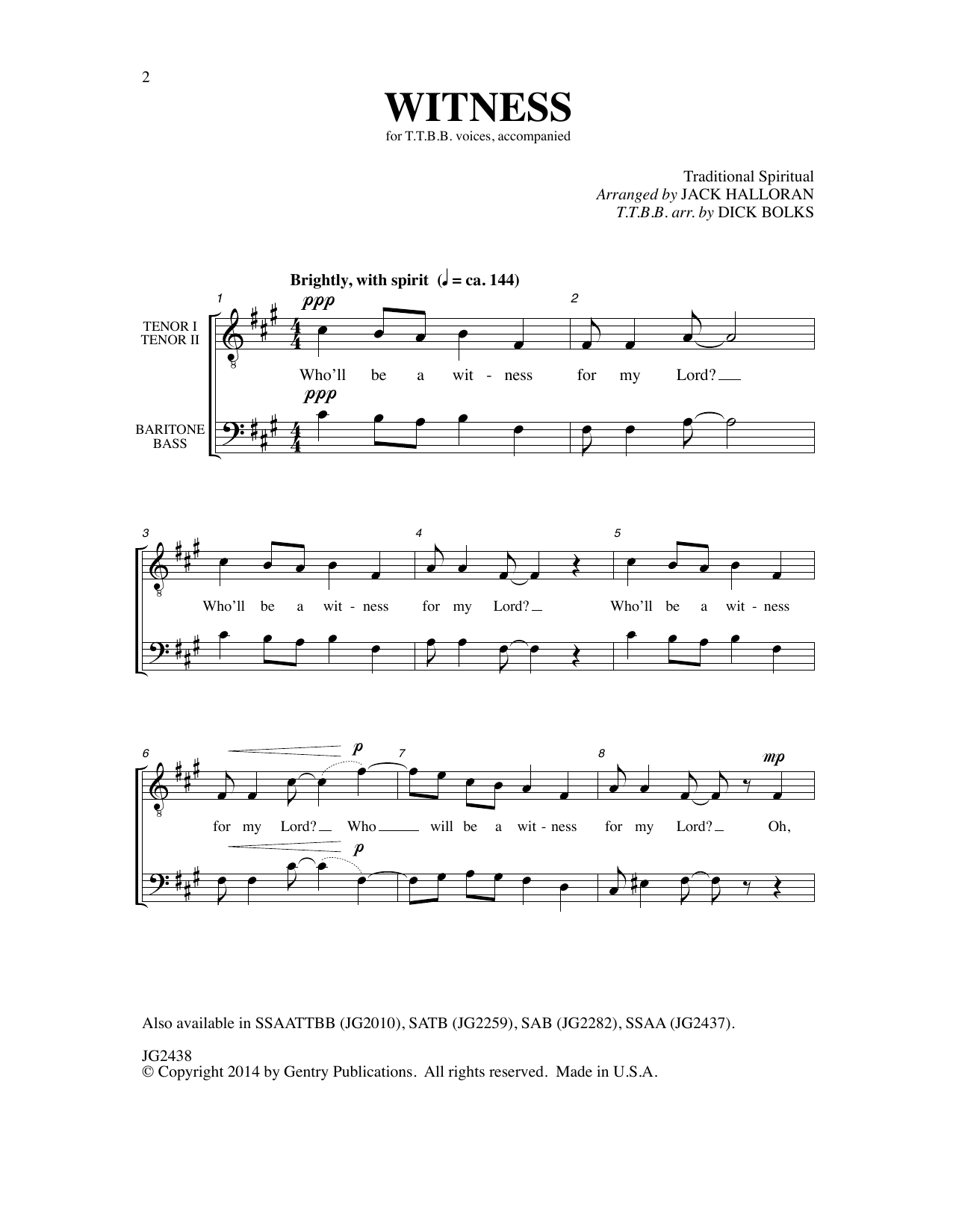 Download or print Dick Bolks Witness sheet music, chords and digital score arranged for TTBB Choir. This Concert score includes 10 page(s).