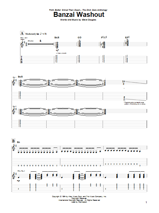 Download or print Dick Dale Banzai Washout sheet music, chords and digital score arranged for Guitar Tab. This Rock score includes 7 page(s).