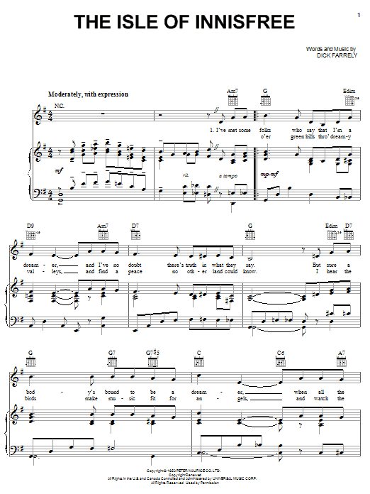 Download or print Dick Farrely The Isle Of Innisfree sheet music, chords and digital score arranged for Piano, Vocal & Guitar Chords (Right-Hand Melody). This Irish score includes 3 page(s).