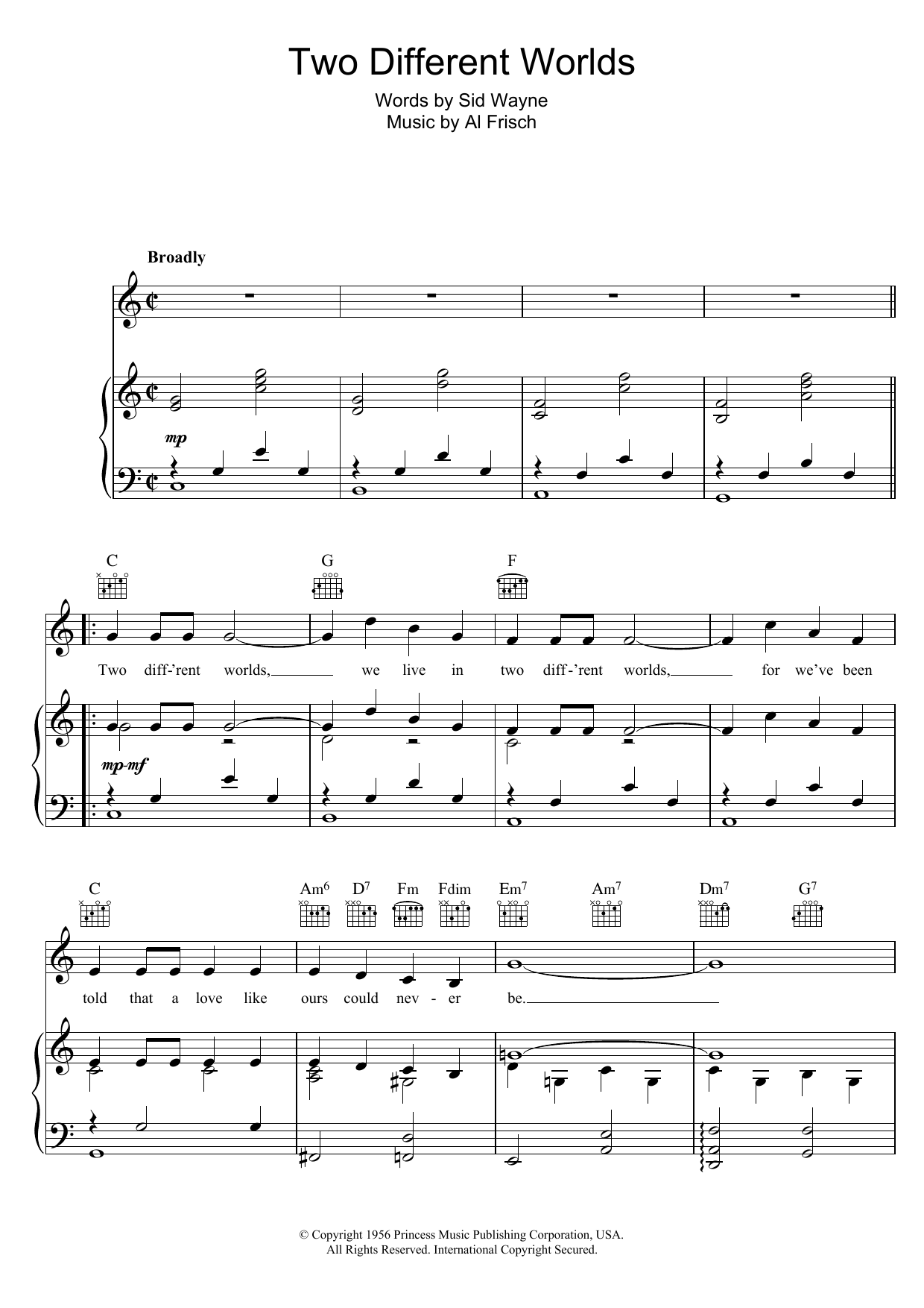 Download or print Dick Haymes Two Different Worlds sheet music, chords and digital score arranged for Piano, Vocal & Guitar Chords. This Standards score includes 3 page(s).