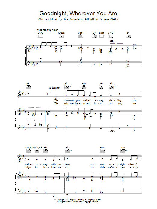 Download or print Dick Robertson Goodnight, Wherever You Are sheet music, chords and digital score arranged for Piano, Vocal & Guitar Chords. This Pop score includes 4 page(s).