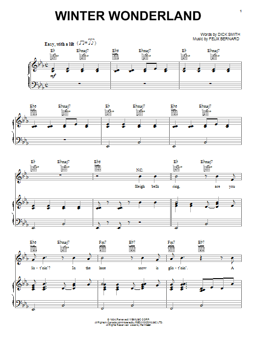 Download or print Dick Smith Winter Wonderland sheet music, chords and digital score arranged for Super Easy Piano. This Christmas score includes 2 page(s).