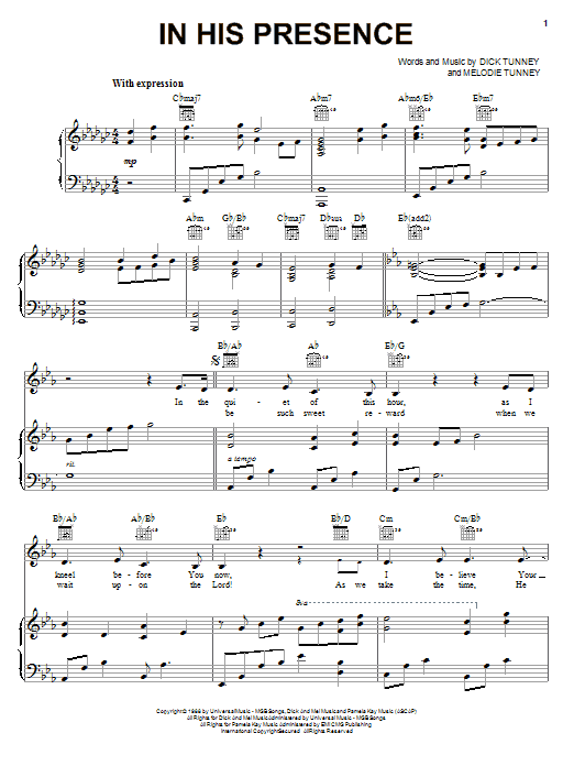 Download or print Dick Tunney In His Presence sheet music, chords and digital score arranged for Piano, Vocal & Guitar Chords (Right-Hand Melody). This Christian score includes 5 page(s).