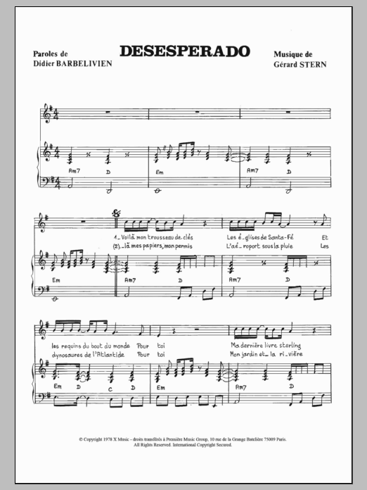 Download or print Didier Barbelivien Desperado sheet music, chords and digital score arranged for Piano & Vocal. This Pop score includes 3 page(s).