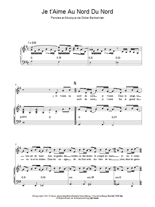 Download or print Didier Barbelivien Je T'aime Au Nord Du Nord sheet music, chords and digital score arranged for Piano & Vocal. This French score includes 3 page(s).