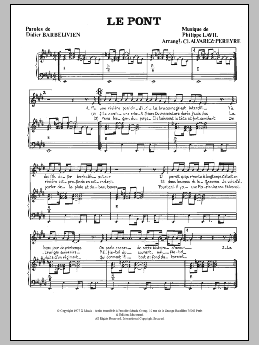 Download or print Didier Barbelivien Le Pont sheet music, chords and digital score arranged for Piano & Vocal. This Pop score includes 2 page(s).