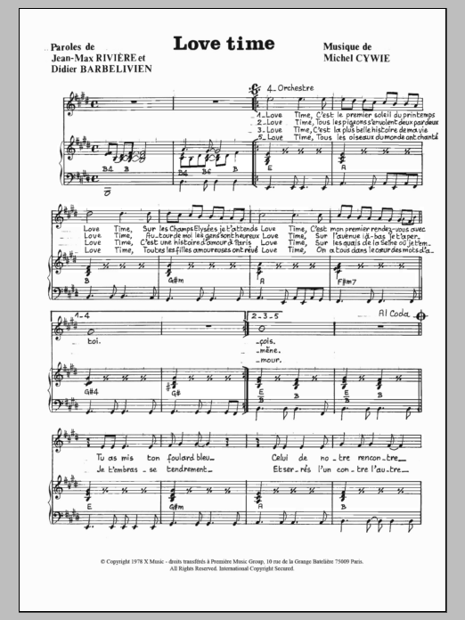 Download or print Didier Barbelivien Love Time sheet music, chords and digital score arranged for Piano & Vocal. This Pop score includes 2 page(s).