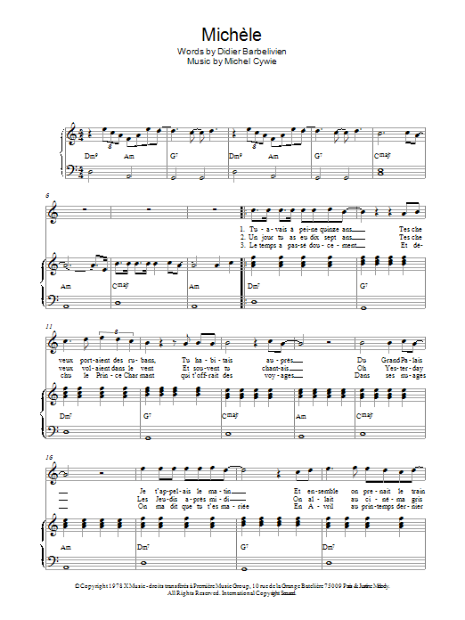 Download or print Didier Barbelivien Michele sheet music, chords and digital score arranged for Piano & Vocal. This Pop score includes 2 page(s).