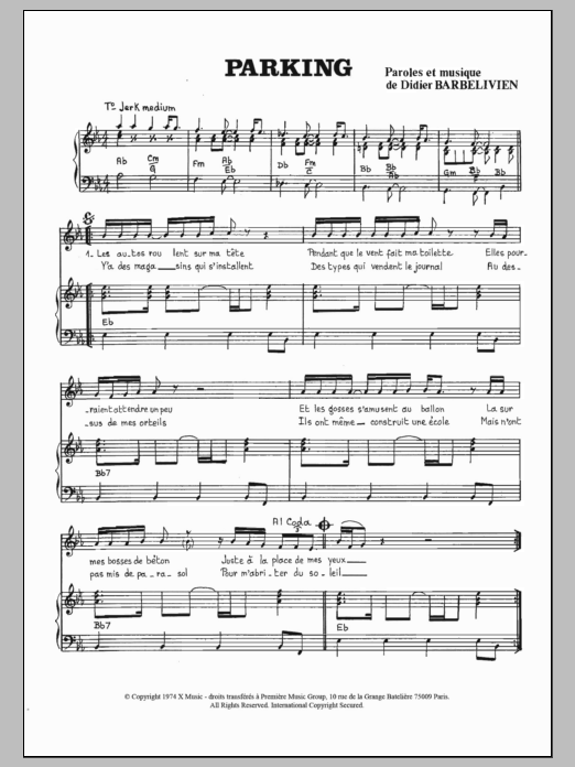 Download or print Didier Barbelivien Parking sheet music, chords and digital score arranged for Piano & Vocal. This French score includes 3 page(s).