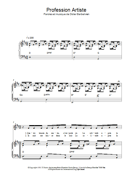 Download or print Didier Barbelivien Profession Artiste sheet music, chords and digital score arranged for Piano & Vocal. This Pop score includes 3 page(s).