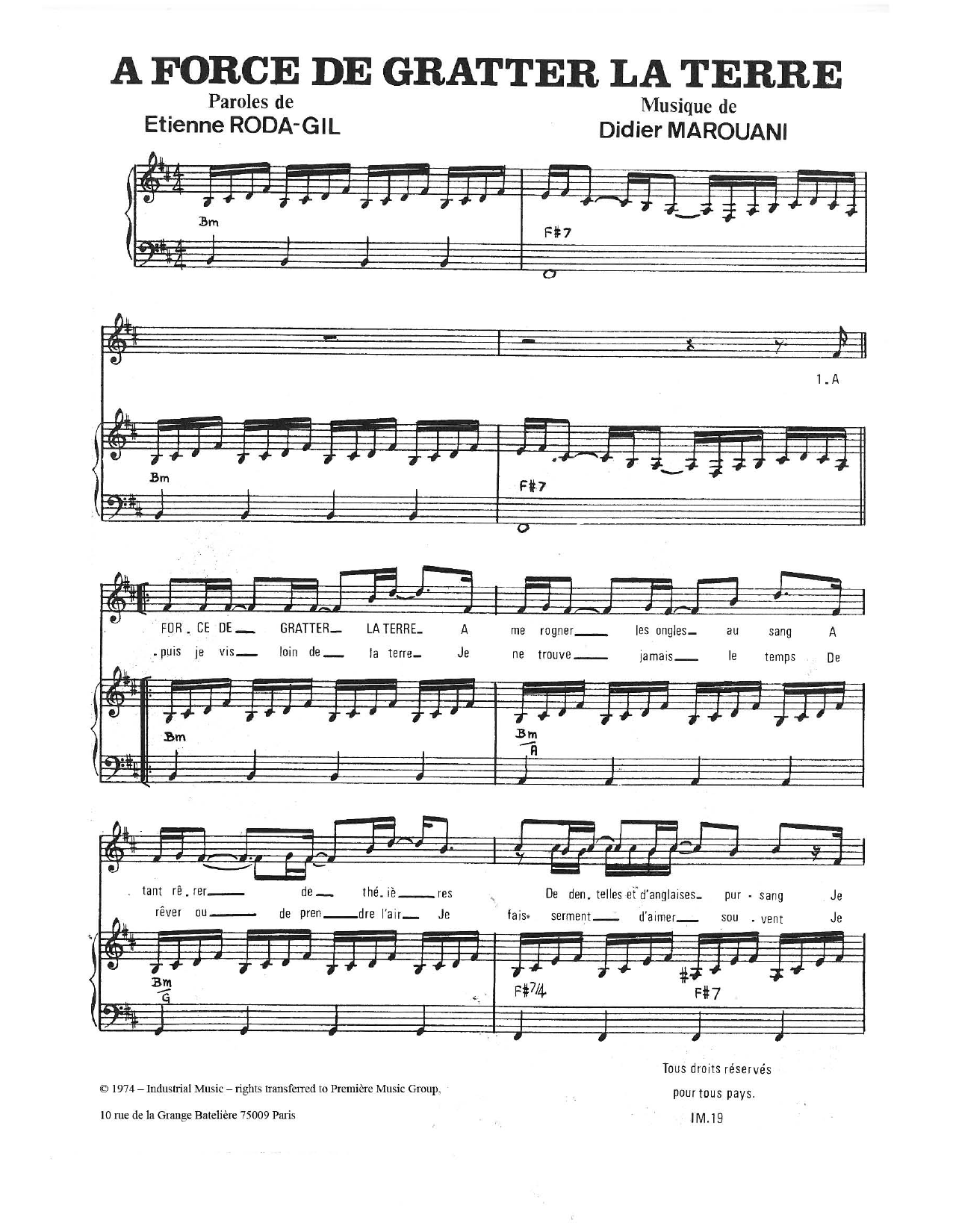 Download or print Didier Marouani A Force De Gratter La Terre sheet music, chords and digital score arranged for Piano & Vocal. This Standards score includes 3 page(s).