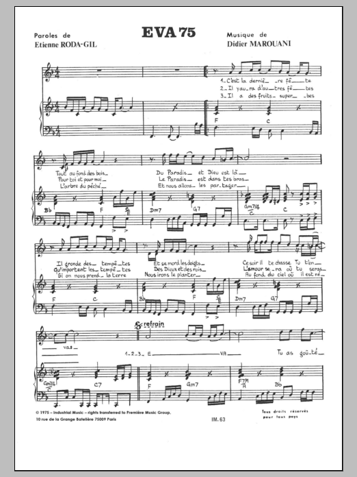 Download or print Didier Marouani Eva 75 sheet music, chords and digital score arranged for Piano & Vocal. This French score includes 2 page(s).