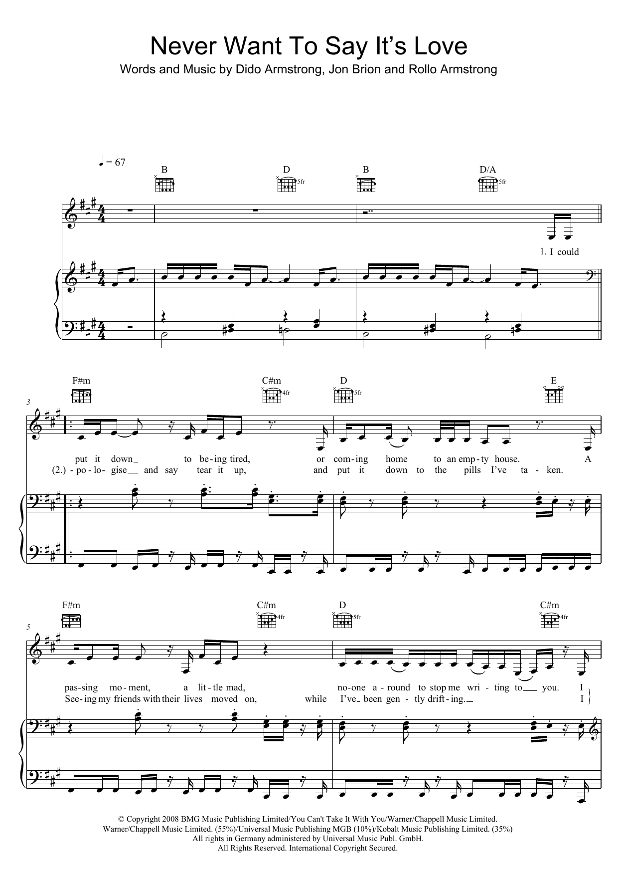 Download or print Dido Never Want To Say It's Love sheet music, chords and digital score arranged for Piano, Vocal & Guitar Chords (Right-Hand Melody). This Pop score includes 5 page(s).