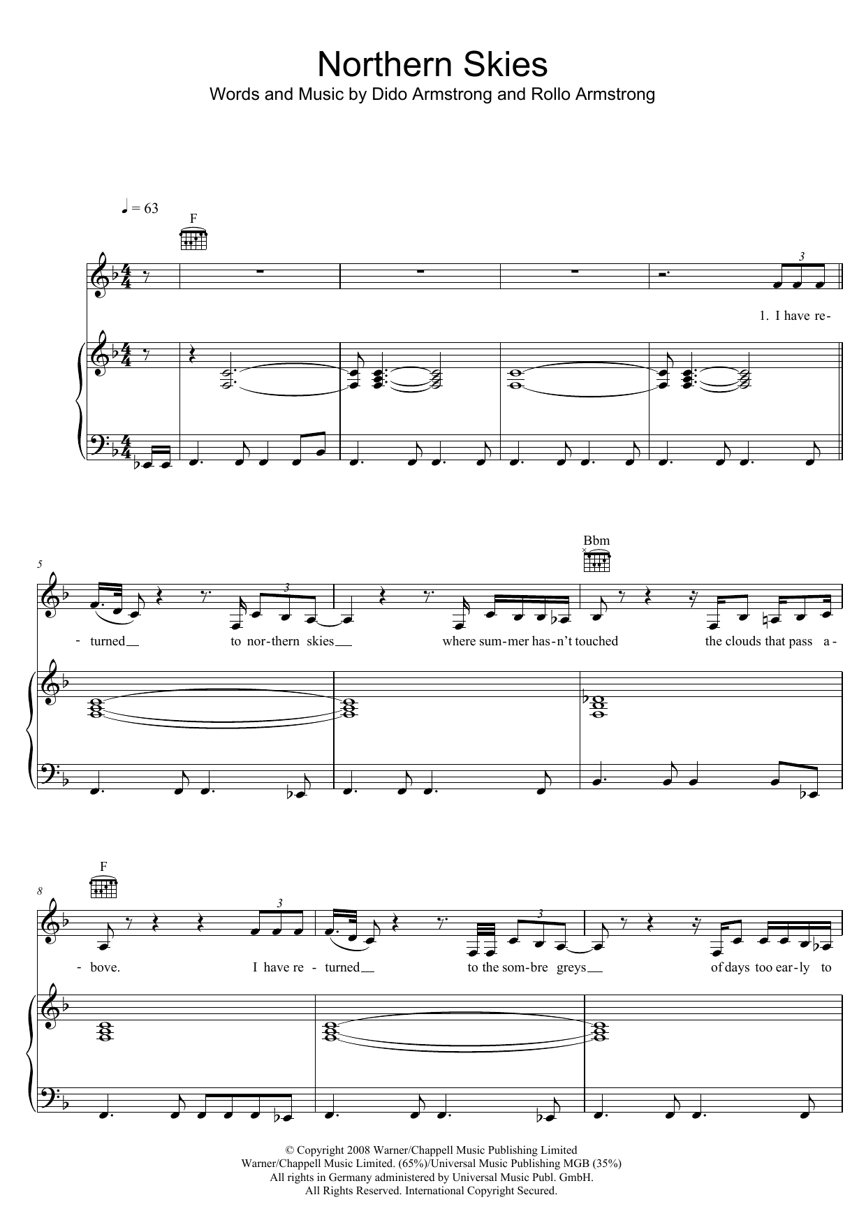 Download or print Dido Northern Skies sheet music, chords and digital score arranged for Piano, Vocal & Guitar Chords (Right-Hand Melody). This Pop score includes 6 page(s).