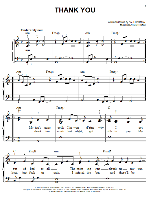 Download or print Dido Thank You sheet music, chords and digital score arranged for Easy Piano. This Pop score includes 7 page(s).
