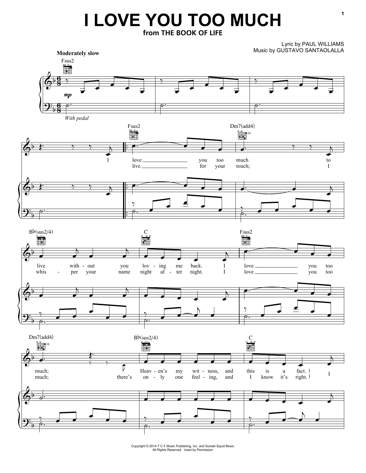 Download or print Paul Williams I Love You Too Much sheet music, chords and digital score arranged for Piano, Vocal & Guitar Chords (Right-Hand Melody). This Children score includes 6 page(s).