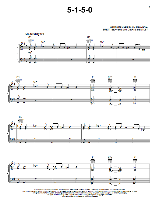 Download or print Dierks Bentley 5-1-5-0 sheet music, chords and digital score arranged for Piano, Vocal & Guitar Chords (Right-Hand Melody). This Country score includes 7 page(s).