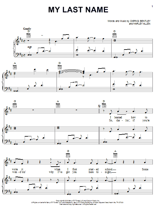 Download or print Dierks Bentley My Last Name sheet music, chords and digital score arranged for Piano, Vocal & Guitar Chords (Right-Hand Melody). This Country score includes 6 page(s).