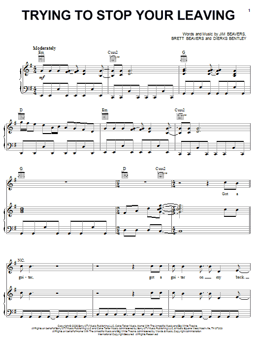 Download or print Dierks Bentley Trying To Stop Your Leaving sheet music, chords and digital score arranged for Piano, Vocal & Guitar Chords (Right-Hand Melody). This Country score includes 8 page(s).