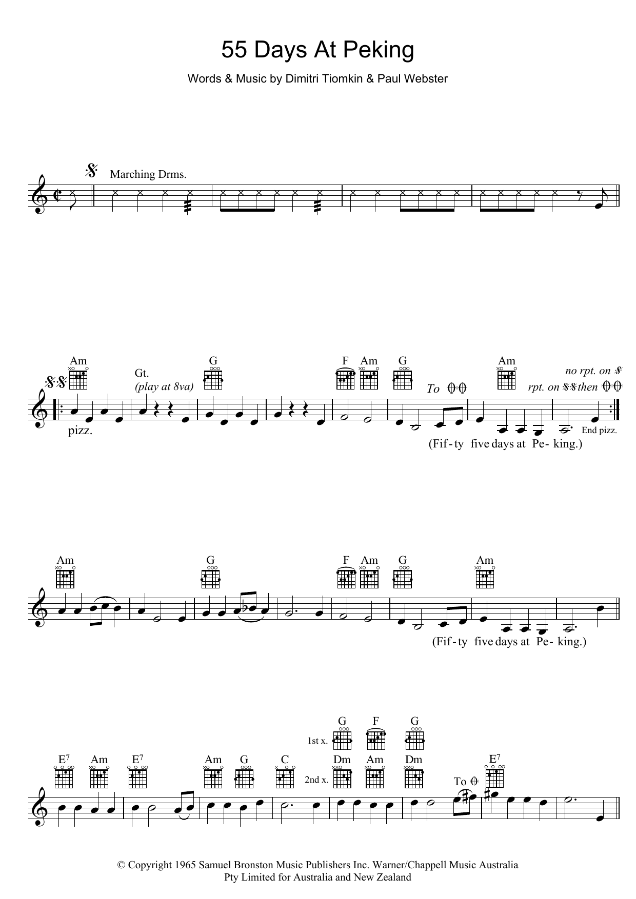 Download or print Dimitri Tiomkin 55 Days At Peking sheet music, chords and digital score arranged for Piano, Vocal & Guitar Chords (Right-Hand Melody). This Film/TV score includes 4 page(s).