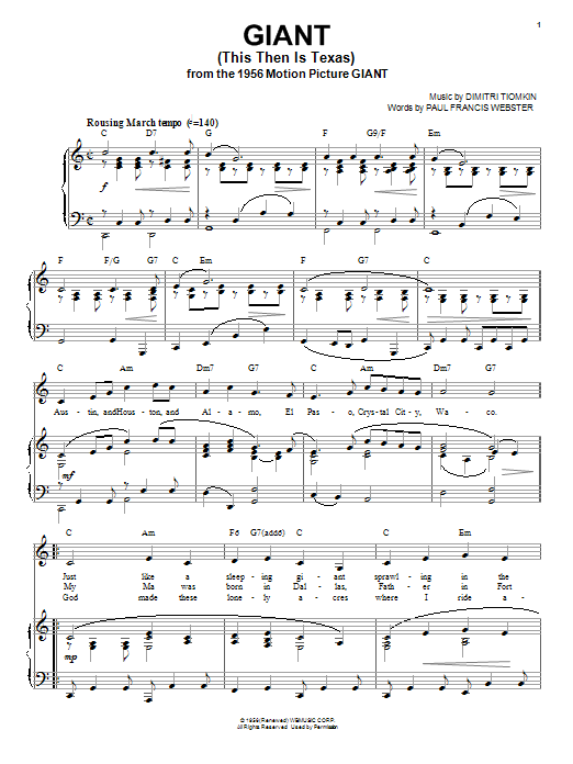 Download or print Dimitri Tiomkin Giant (This Then Is Texas) sheet music, chords and digital score arranged for Piano, Vocal & Guitar Chords (Right-Hand Melody). This Classical score includes 3 page(s).