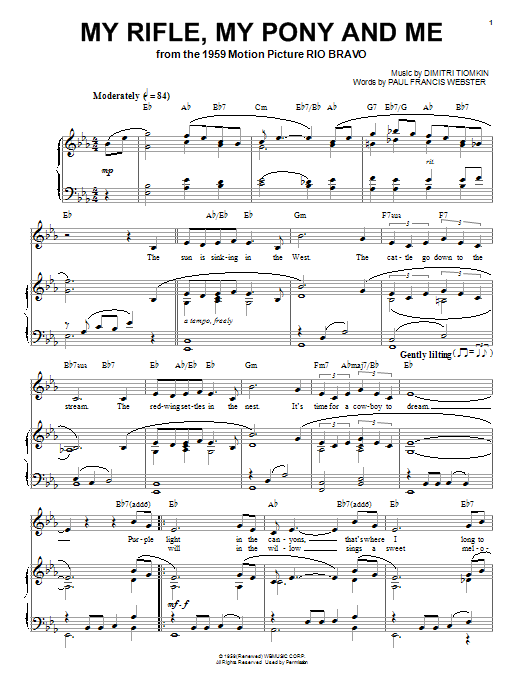 Download or print Dimitri Tiomkin My Rifle, My Pony And Me sheet music, chords and digital score arranged for Piano, Vocal & Guitar Chords (Right-Hand Melody). This Pop score includes 2 page(s).