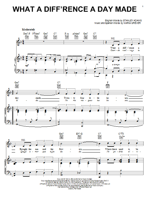 Download or print Dinah Washington What A Diff'rence A Day Made sheet music, chords and digital score arranged for Piano, Vocal & Guitar Chords (Right-Hand Melody). This Jazz score includes 3 page(s).