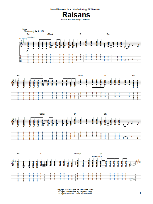 Download or print Dinosaur Jr. Raisans sheet music, chords and digital score arranged for Guitar Tab. This Alternative score includes 9 page(s).