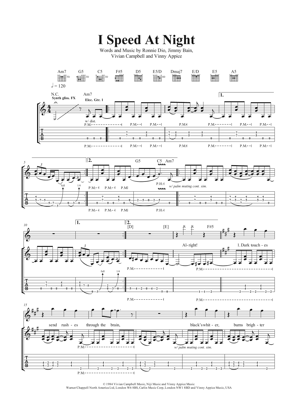 Download or print Dio I Speed At Night sheet music, chords and digital score arranged for Guitar Tab. This Rock score includes 9 page(s).