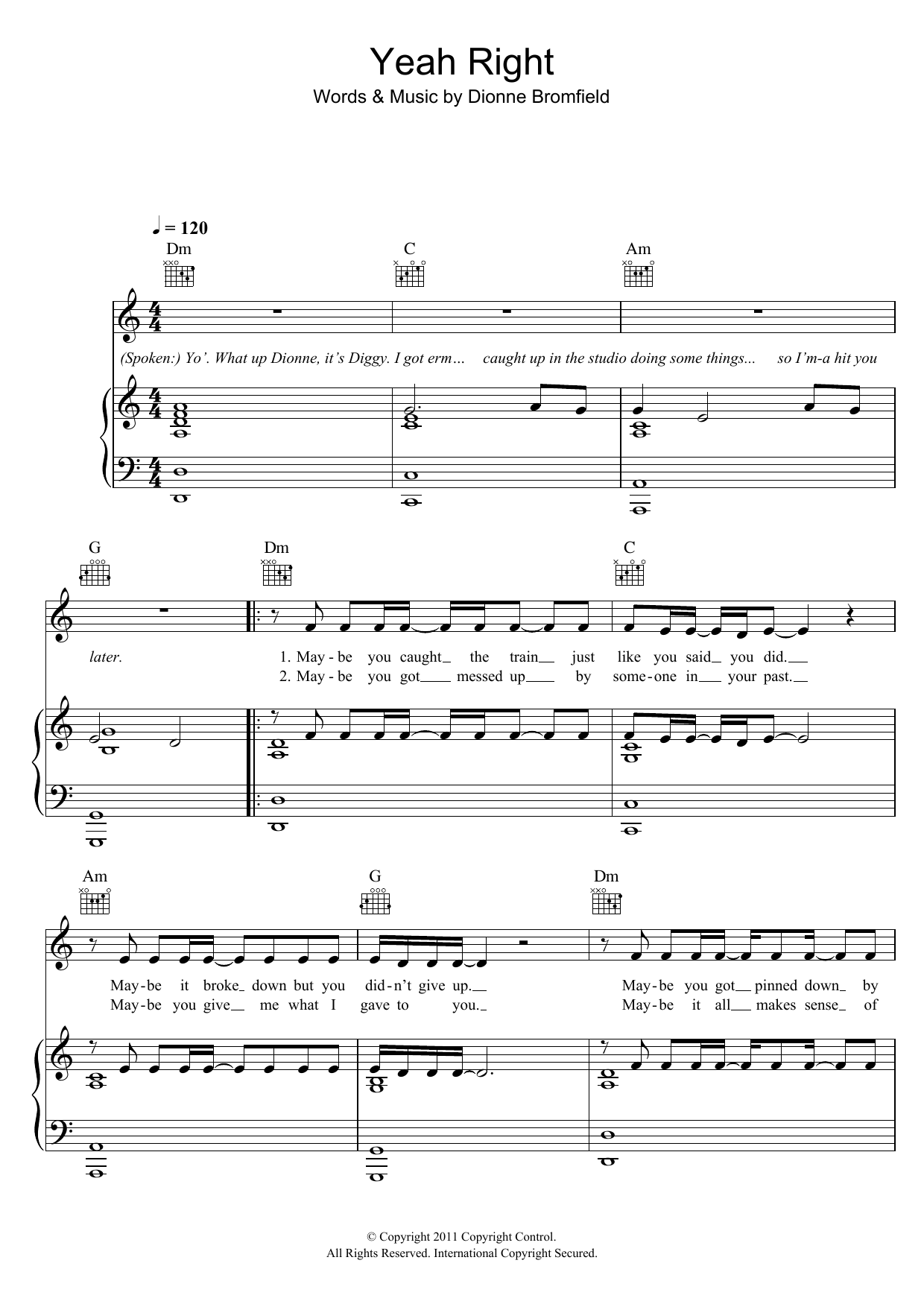Download or print Dionne Bromfield Yeah Right sheet music, chords and digital score arranged for Piano, Vocal & Guitar Chords. This Pop score includes 7 page(s).