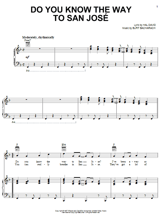 Download or print Dionne Warwick Do You Know The Way To San Jose sheet music, chords and digital score arranged for Piano, Vocal & Guitar Chords (Right-Hand Melody). This Standards score includes 4 page(s).
