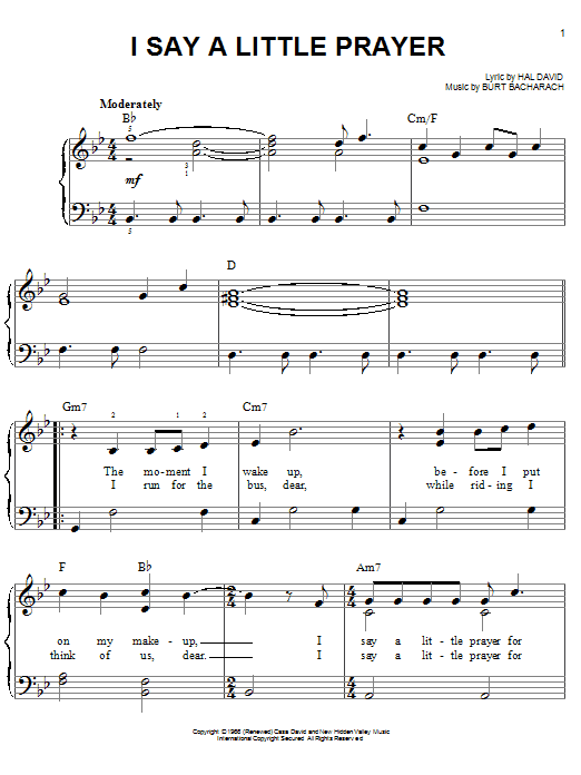 Download or print Dionne Warwick I Say A Little Prayer sheet music, chords and digital score arranged for Really Easy Piano. This Pop score includes 2 page(s).