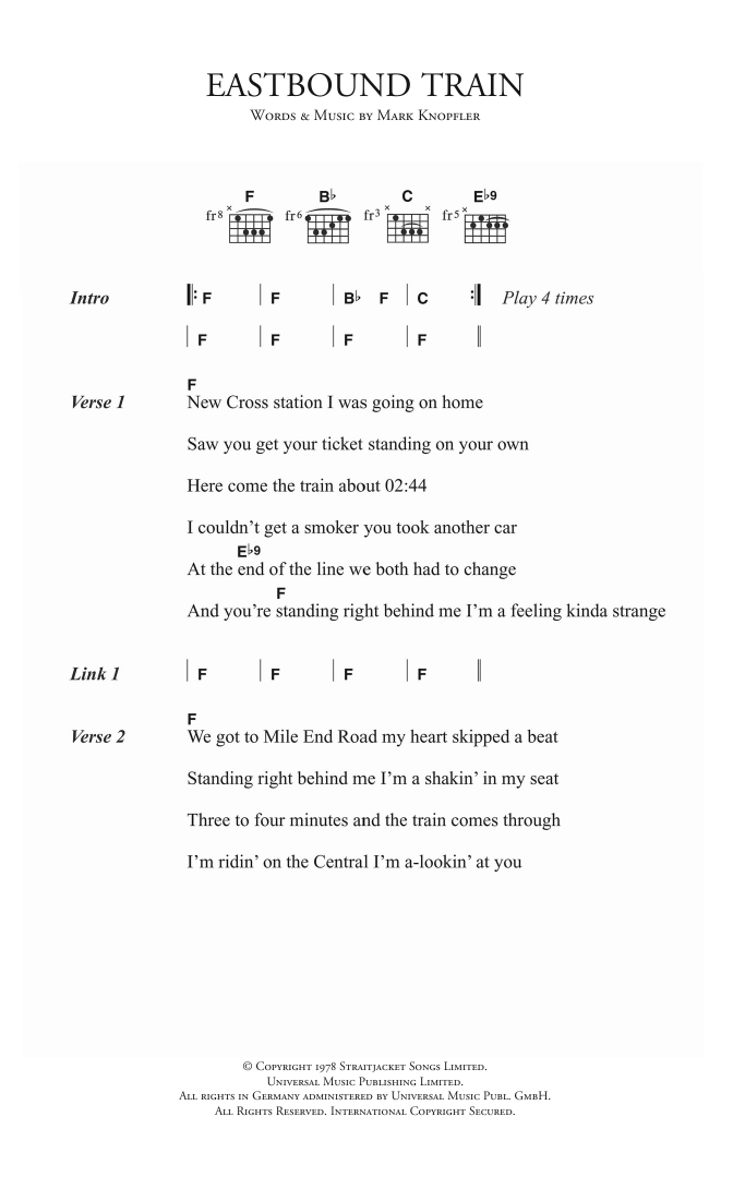 Download or print Dire Straits Eastbound Train sheet music, chords and digital score arranged for Guitar Chords/Lyrics. This Pop score includes 3 page(s).