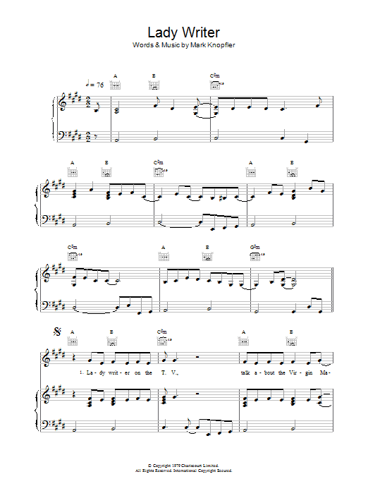 Download or print Dire Straits Lady Writer sheet music, chords and digital score arranged for Piano, Vocal & Guitar Chords. This Pop score includes 5 page(s).