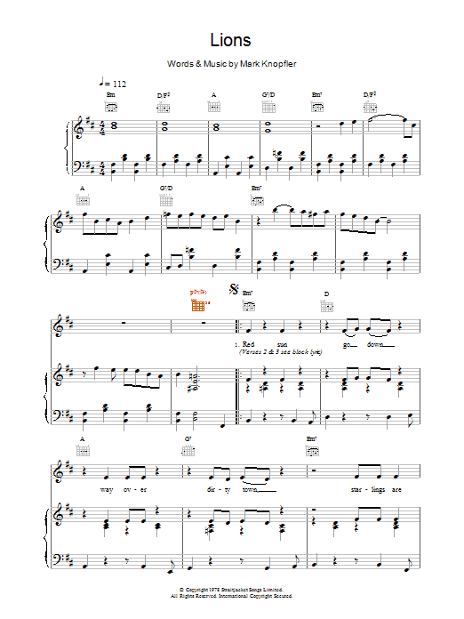 Download or print Dire Straits Lions sheet music, chords and digital score arranged for Guitar Chords/Lyrics. This Rock score includes 2 page(s).
