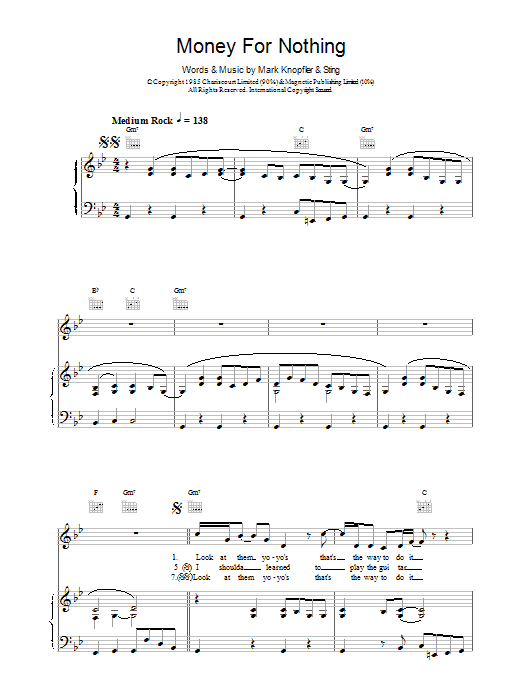 Download or print Dire Straits Money For Nothing sheet music, chords and digital score arranged for Piano, Vocal & Guitar Chords (Right-Hand Melody). This Pop score includes 5 page(s).