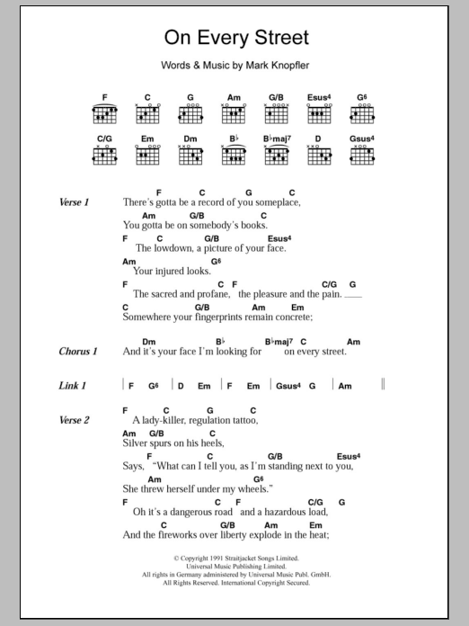 Download or print Dire Straits On Every Street sheet music, chords and digital score arranged for Guitar Tab. This Pop score includes 4 page(s).