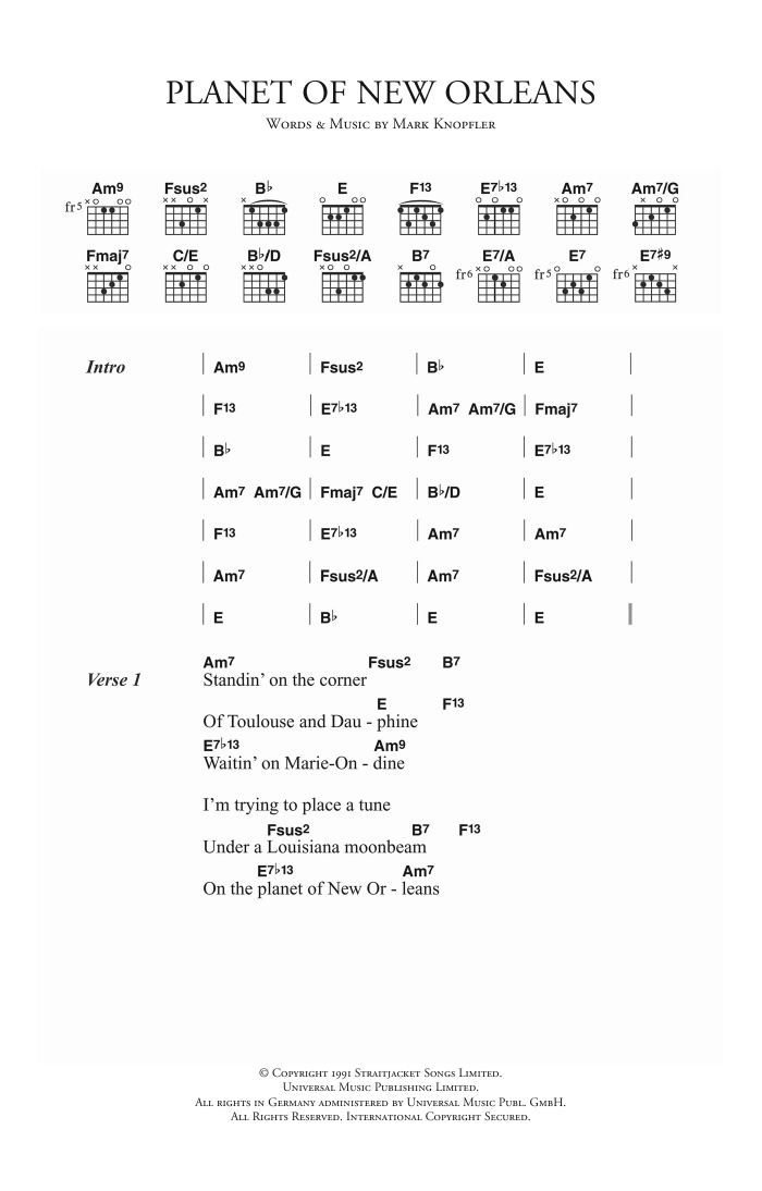 Download or print Dire Straits Planet Of New Orleans sheet music, chords and digital score arranged for Guitar Chords/Lyrics. This Pop score includes 4 page(s).