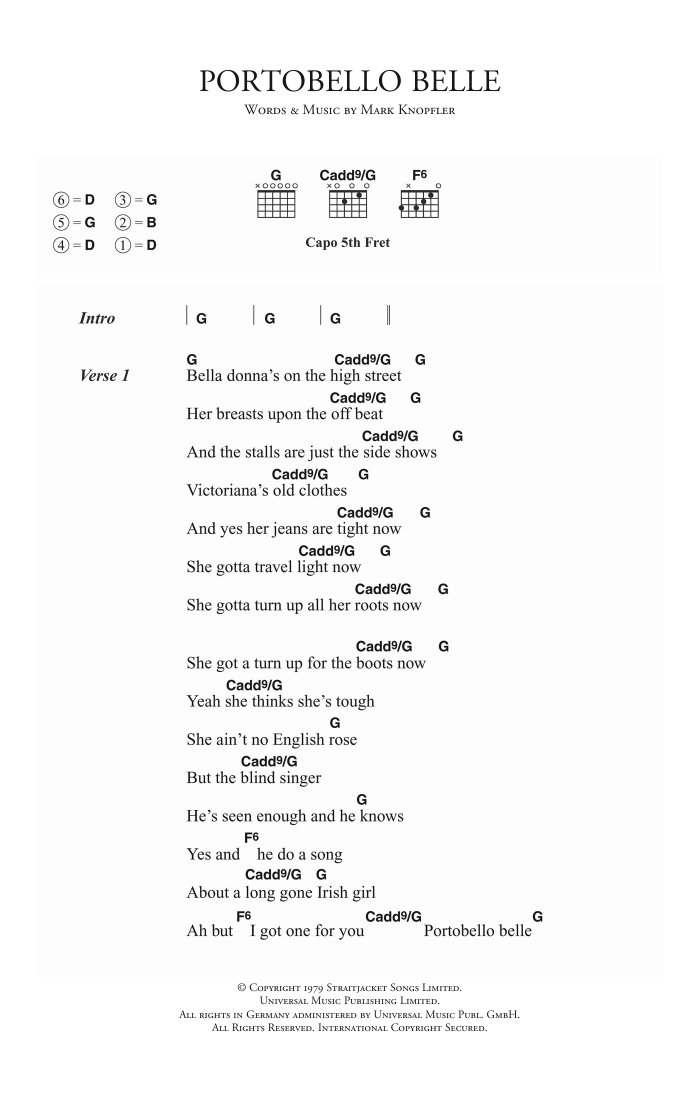 Download or print Dire Straits Portobello Belle sheet music, chords and digital score arranged for Guitar Chords/Lyrics. This Pop score includes 3 page(s).