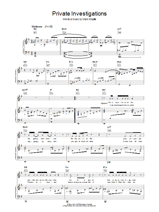 Download or print Dire Straits Private Investigations sheet music, chords and digital score arranged for Guitar Tab. This Rock score includes 8 page(s).