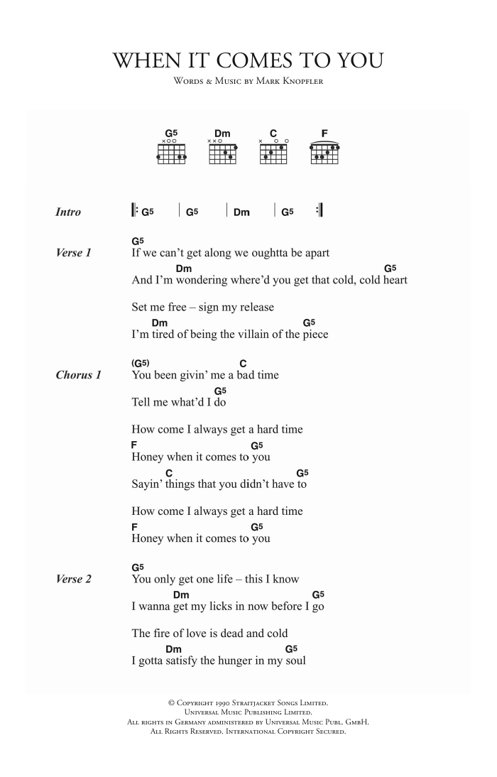 Download or print Dire Straits When It Comes To You sheet music, chords and digital score arranged for Guitar Chords/Lyrics. This Pop score includes 2 page(s).